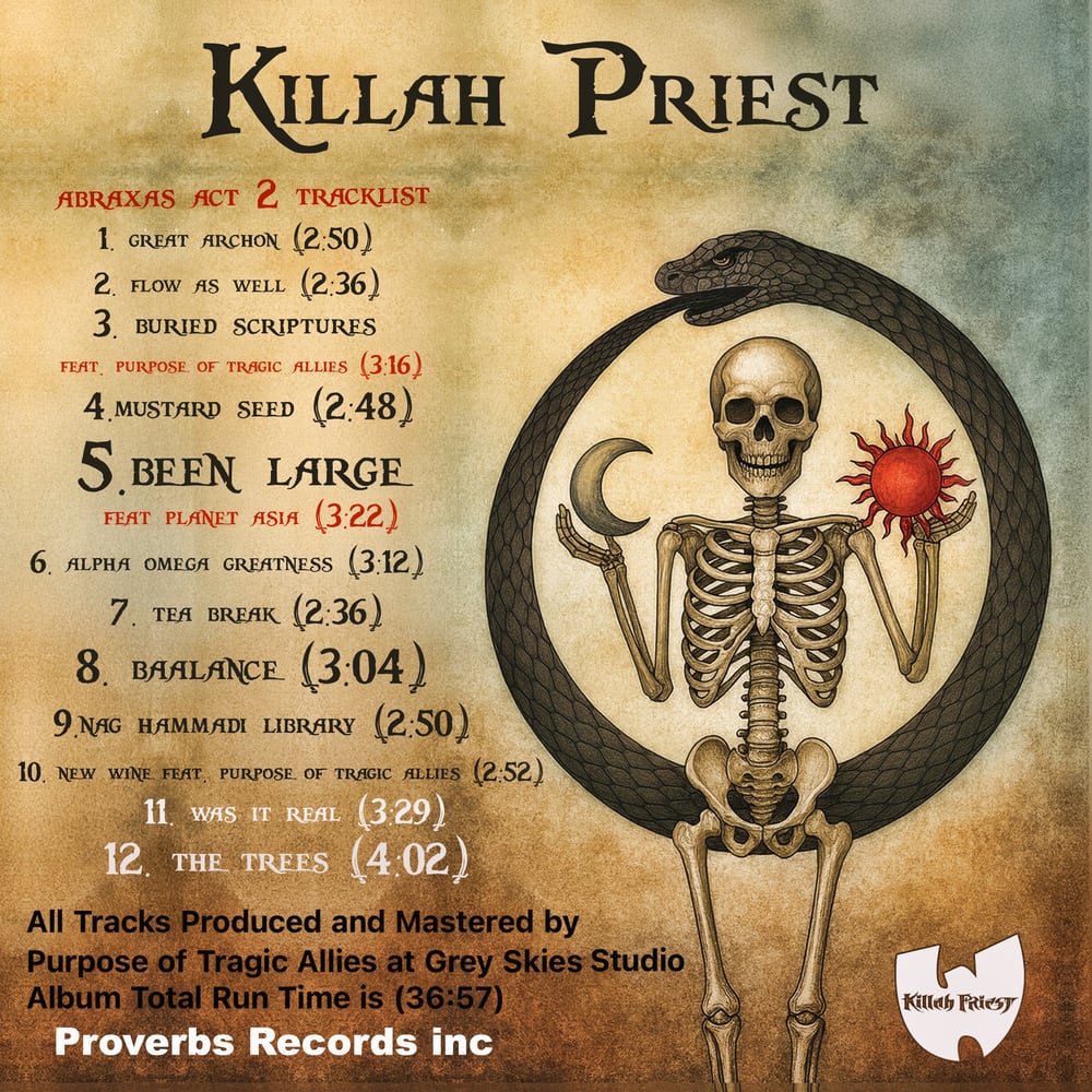 Now, "Abraxas 2" promises to take you deeper—expect transcendental verses, cinematic beats, and a spiritual journey that bridges the divine and the street. Pre-order now and be among the first to experience Killah Priest at his most profound and powerful yet.